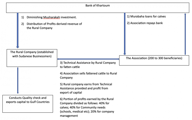 The group of businessmen registered the Wad Balal Company with the mission of investing in livestock production assets for the community, as well as to purchase the livestock from the community for export to the Middle East. In addition, they also helped the herders register the Wad Balal Cooperative Association, with the aim of supplying livestock to their company. In this project, BOK made two main contracts: (a) a Murabaha (trade) financing to purchase calves for the Wad Balal Association; and (b) a diminishing Musharaka (decreasing partnership) financing to purchase livestock production assets for the Wad Balal Company. Due to the low educational level and capacity of the members of the Wad Balal Association, the Wad Balal Company was expected to help the association maintain production standards for export. In the first contract, BOK would provide the financing for the purchase of calves for the association. By purchasing in bulk, BOK helped the association to acquire calves at a lower price. The mark-up of the Murabaha was set at 15% per annum. No collateral was provided for the transaction, but the Wad Balal Company agreed to provide a 55% guarantee for repayment of the cattle financing.